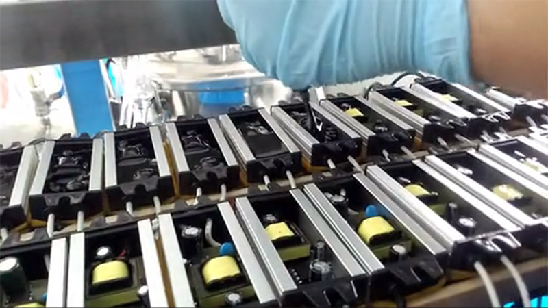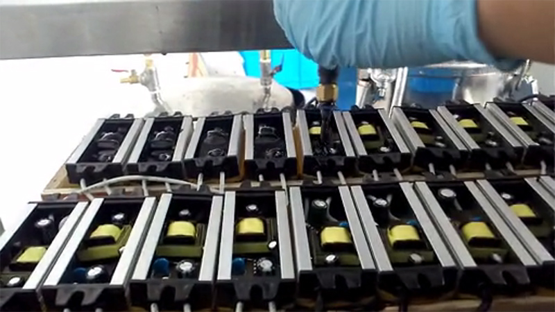 電子灌封膠有雙組份,也有單組份,本案例客戶深圳電子科技有限公司使用我司雙組份電子灌封膠進行電源灌模密封。采用機器進行真空環境下操作配比,將配比后的電子灌封膠經過管道輸出就可以用于電源灌封使用。下面是客戶生產視頻拍攝由于手機拍攝像素問題導致不清晰,請諒解。